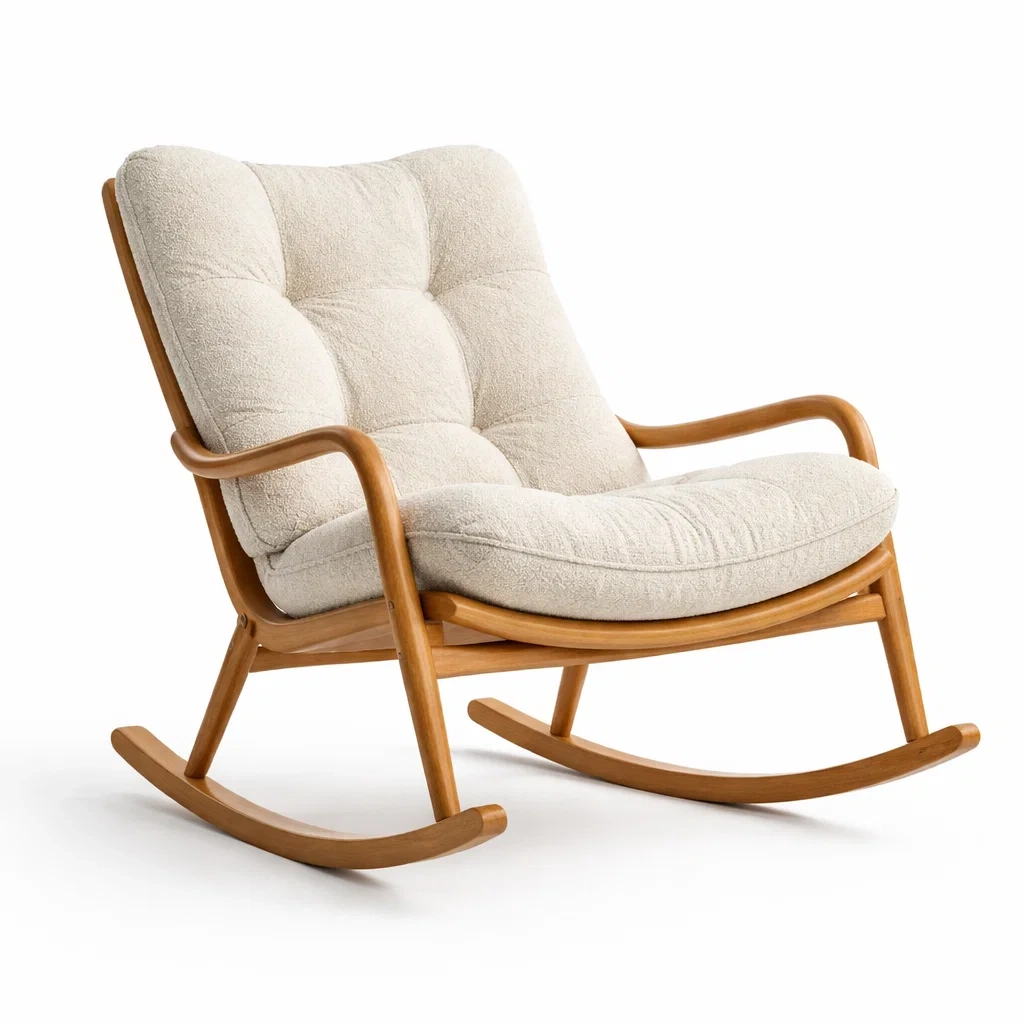 Fauteuil à bascule en tissu beige et bois
