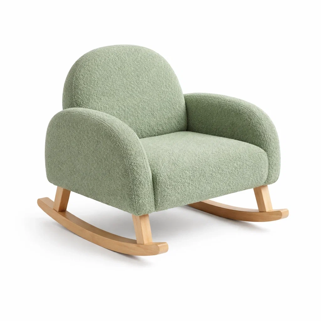 Fauteuil à bascule enfant en laine bouclée verte avec base en bois
