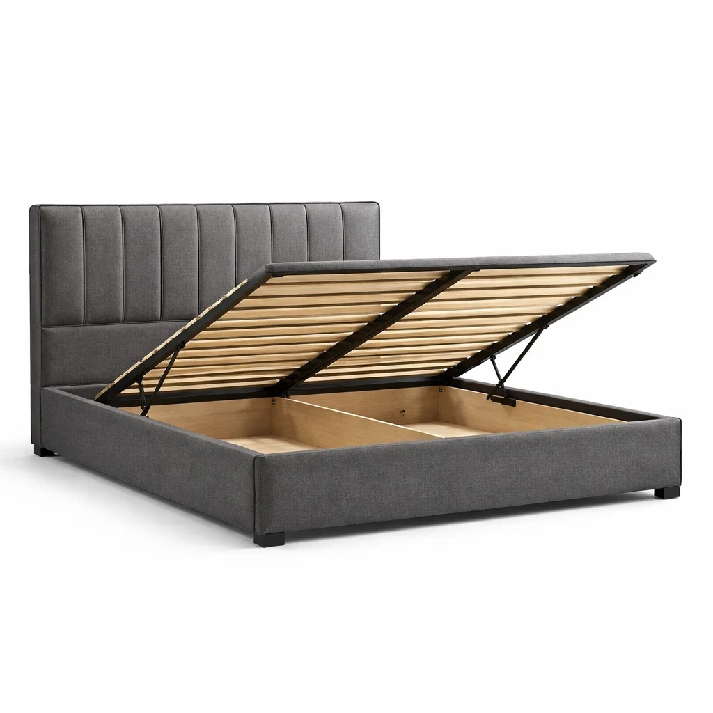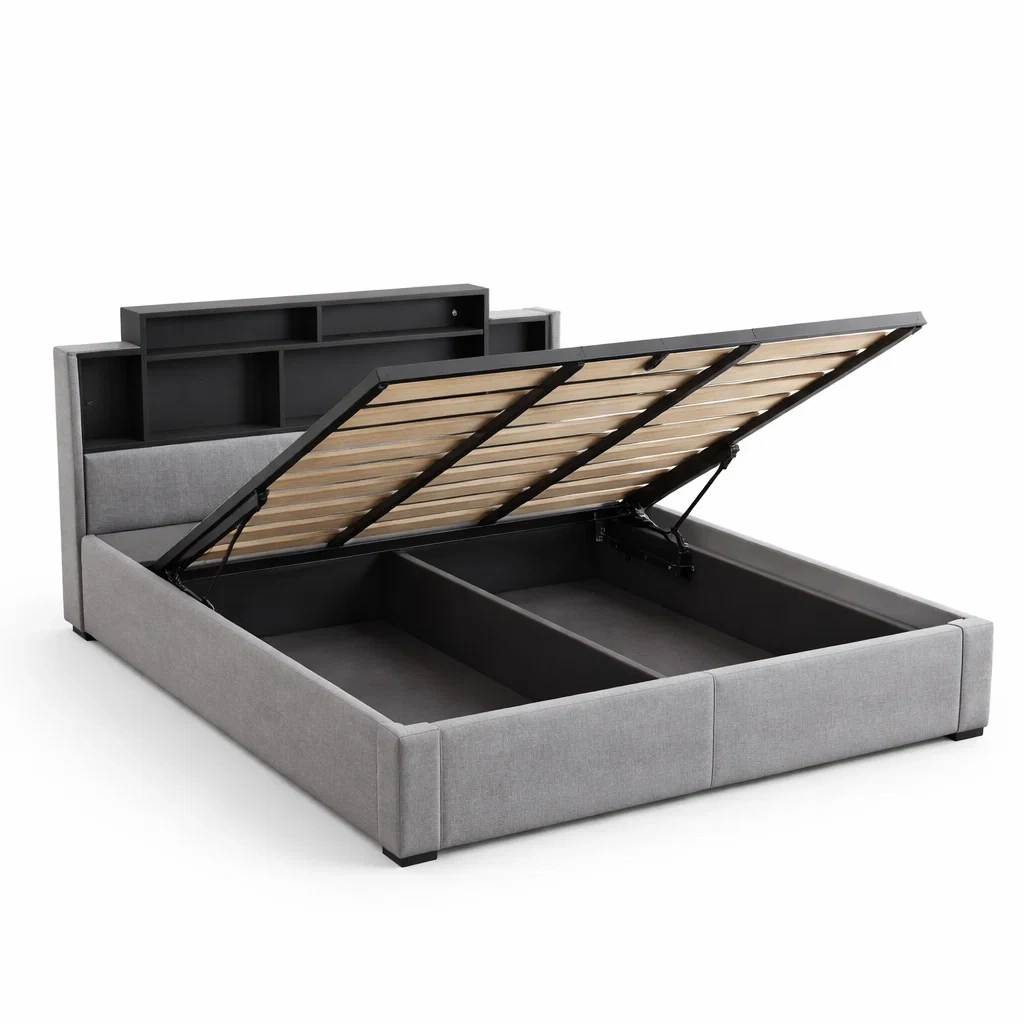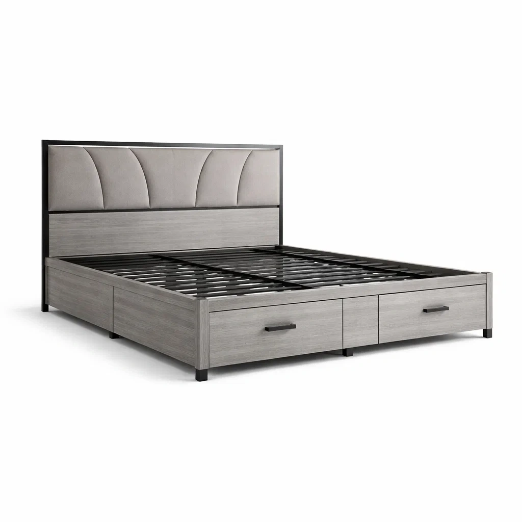 Lit coffre plateforme avec tiroirs en tissu gris et bois