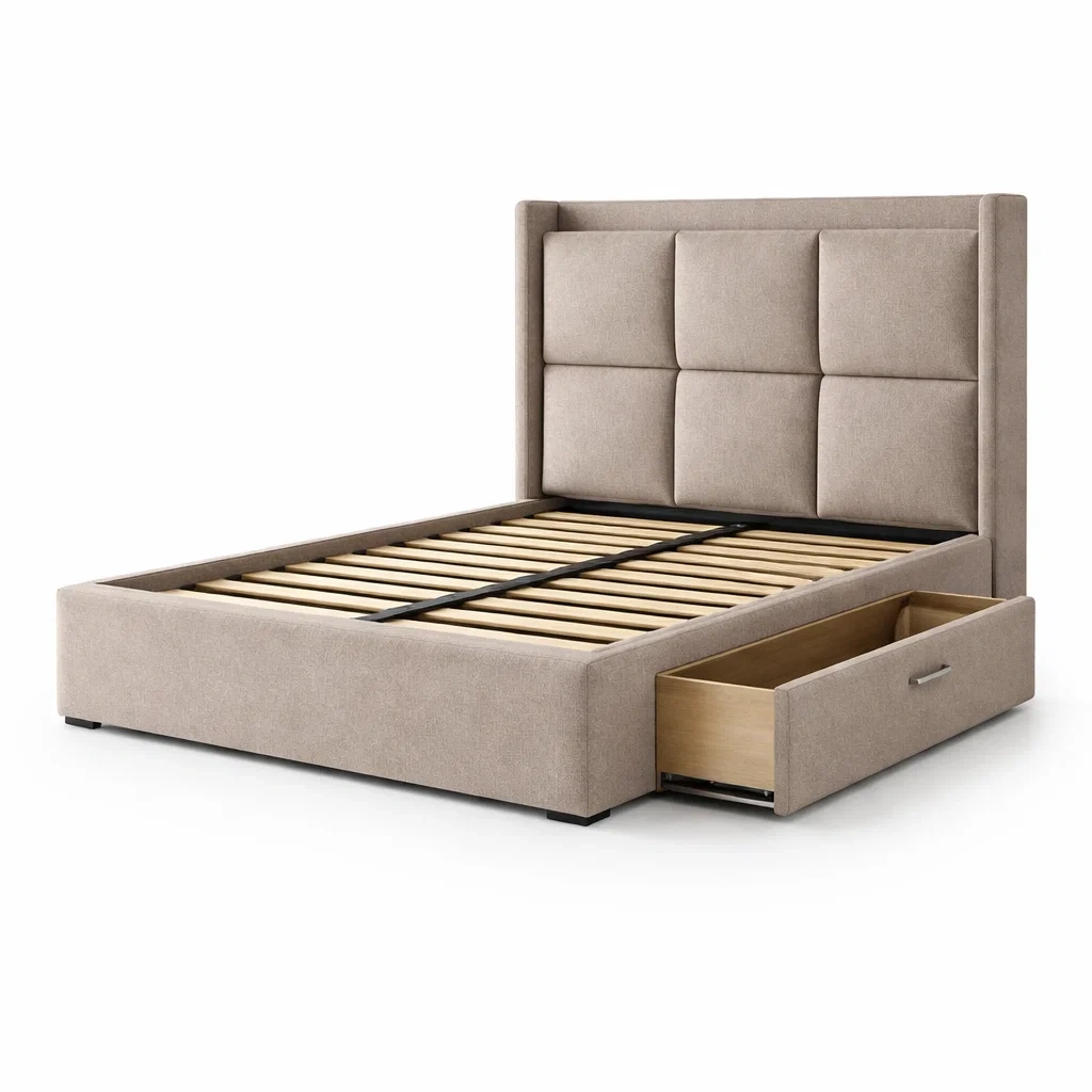 Lit avec rangement en tissu beige avec tête de lit capitonnée et tiroirs
