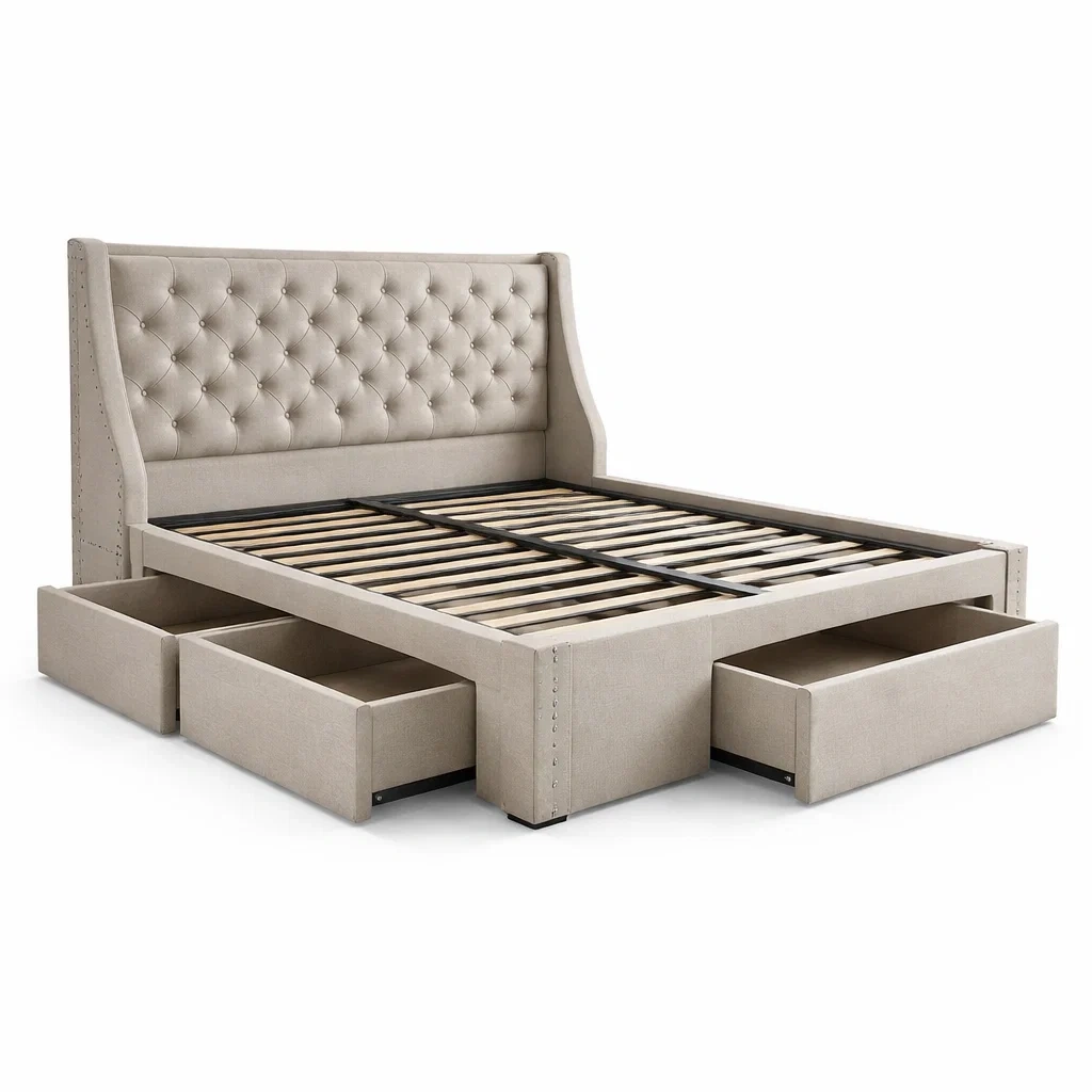 Le lit est équipé de trois tiroirs de rangement pour un espace optimisé