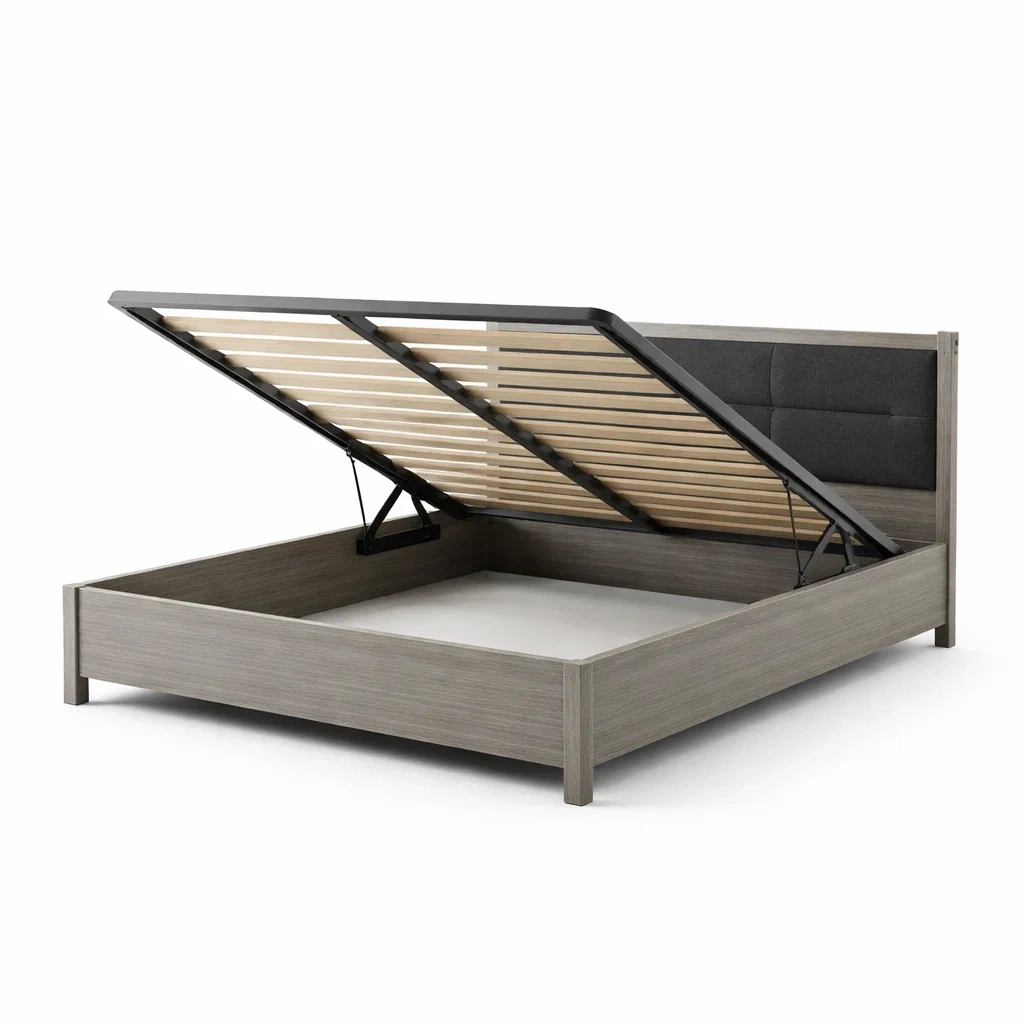 Lit coffre en bois et métal avec mécanisme de levage à gaz pour un accès facile au rangement sous le lit. La tête de lit est rembourrée avec un tissu polyester gris foncé. Le cadre de lit est en métal pour une structure stable. Dimensions totales: 200 cm de longueur, 160 cm de largeur, 120 cm de hauteur.