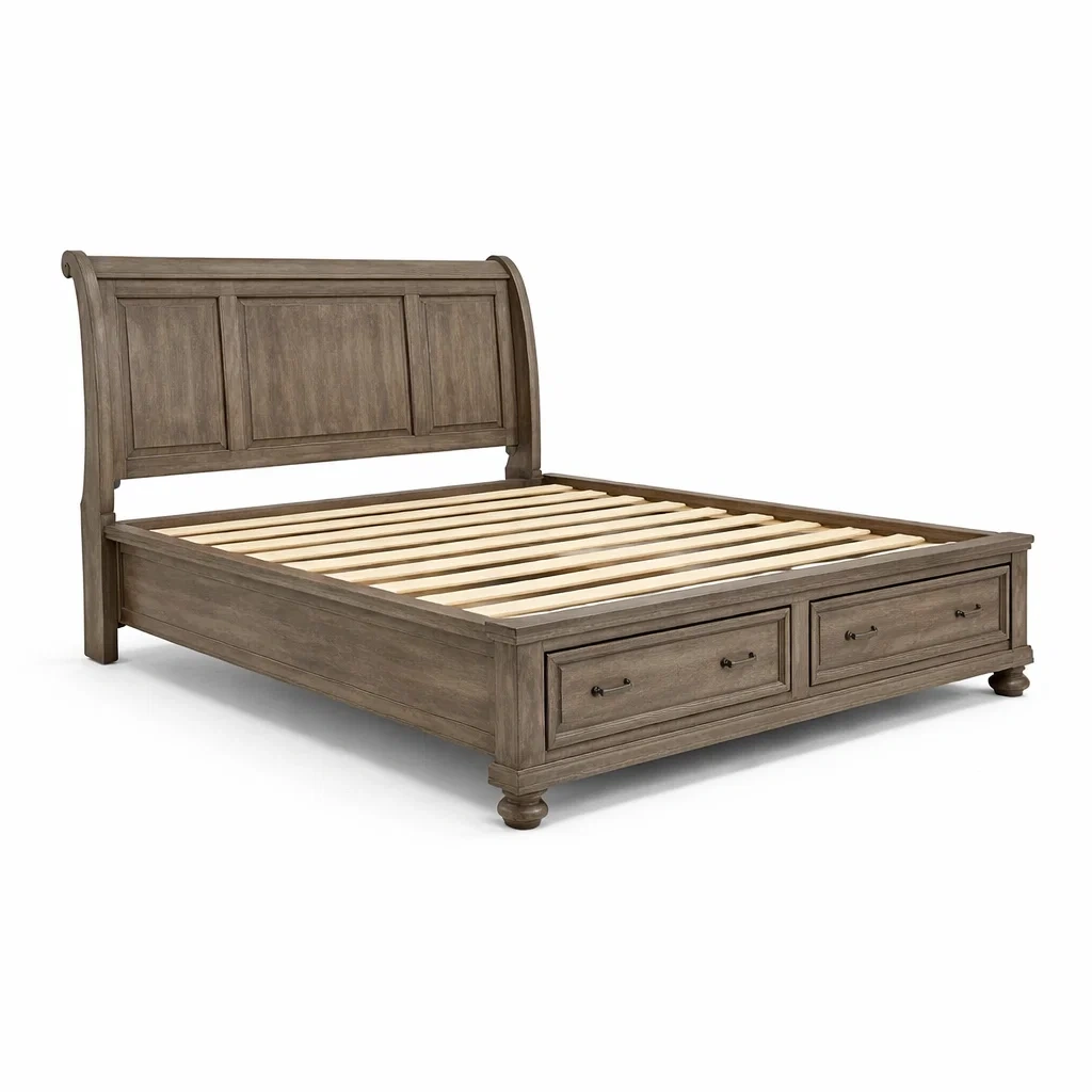 Ce lit est fabriqué en bois massif de chêne avec une finition satinée. Il comprend deux tiroirs de rangement intégrés pour un espace de stockage supplémentaire. Ce lit de plateforme est compatible avec un matelas standard.
